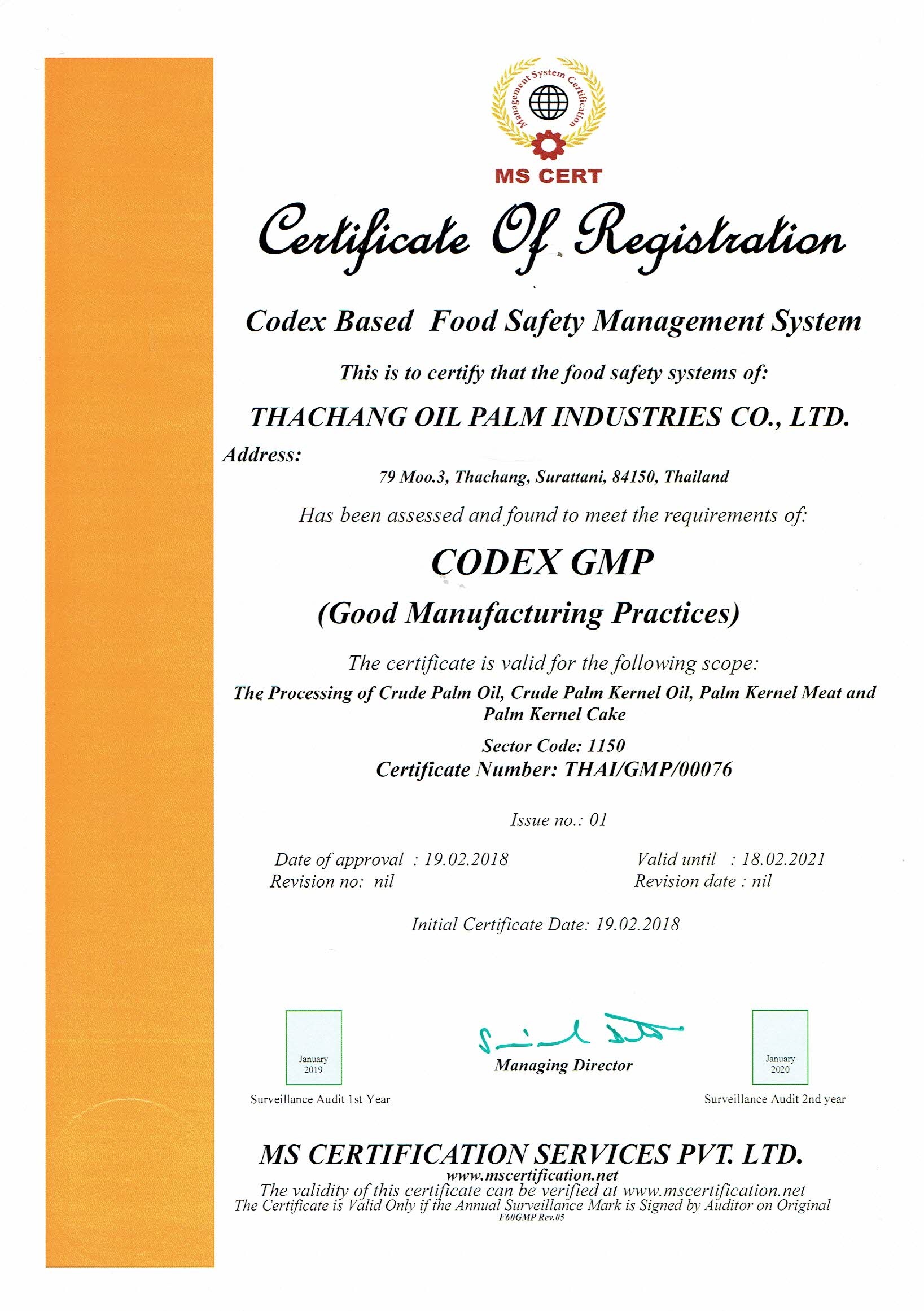 บริษัทท่าฉางสวนปาล์มน้ำมันอุตสาหกรรม จำกัด ผ่านการรับรองมาตรฐาน GMP CODEX