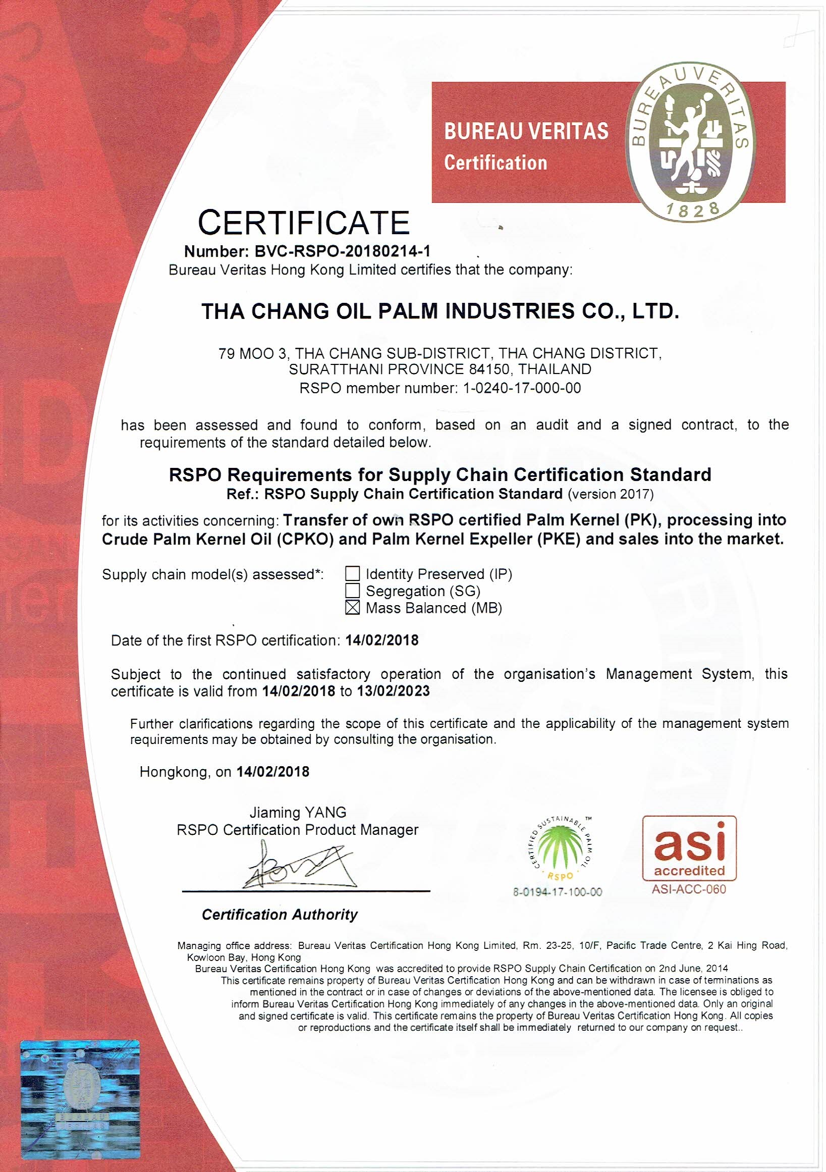 บริษัทท่าฉางสวนปาล์มน้ำมันอุตสาหกรรม จำกัด ผ่านการรับรองมาตรฐาน RSPO Supply Chain