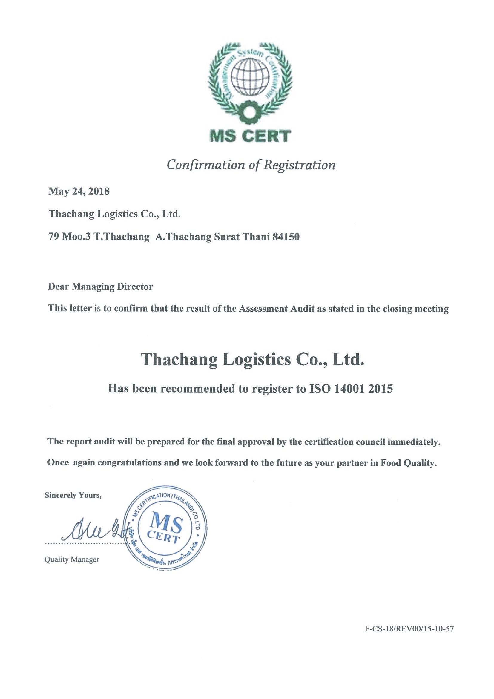 บริษัทท่าฉางโลจิสติกส์ จำกัด ผ่านการรับรอง ISO14001:2015