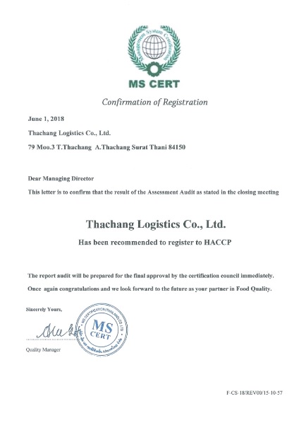 บริษัทท่าฉางโลจิสติกส์ จำกัด ผ่านการรับรอง HACCP