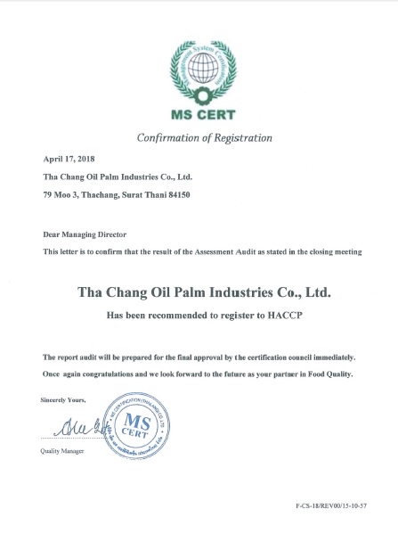 บริษัทท่าฉางสวนปาล์มน้ำมันอุตสาหกรรม จำกัด ผ่านการรับรอง HACCP